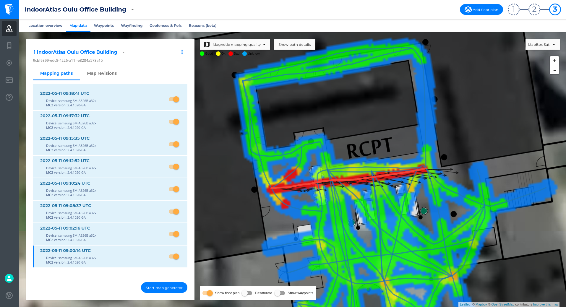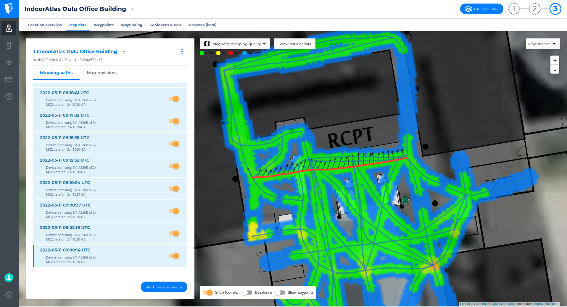 However, as the deployment process of the IndoorAtlas positioning service is often an iterative process, and you are learning by doing, the 'mapping quality and coverage' analytics view (see below) in MapCreator is provided to help you to detect more easily if there are remaining issues in certain areas of the map that may cause positioning performance problems.